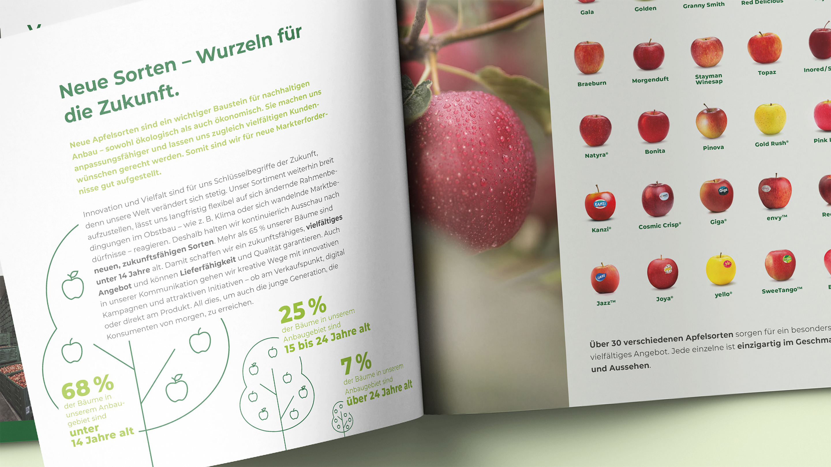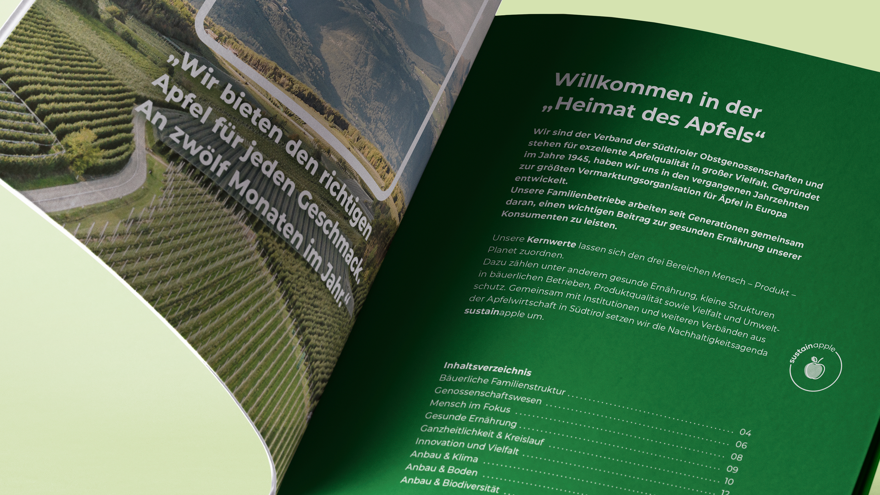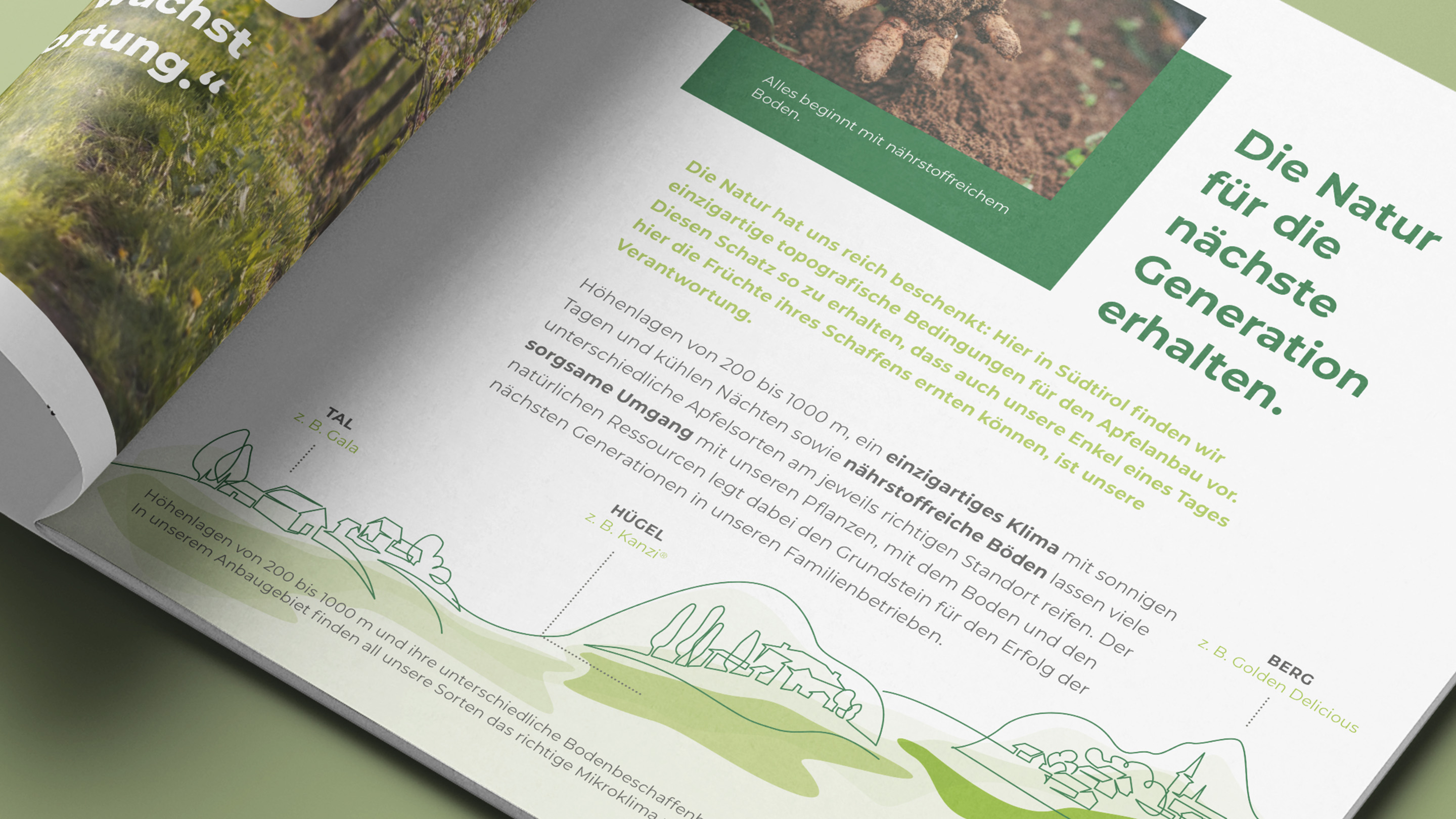 We developed the VOG sustainability brochure for the Association of South Tyrolean Fruit Cooperatives (VOG), which presents the central and diverse sustainability aspects of the association in a compact and appealing way. The aim was to make the comprehensive measures and values that VOG pursues in the area of sustainability not only informative, but also visually and emotionally tangible.