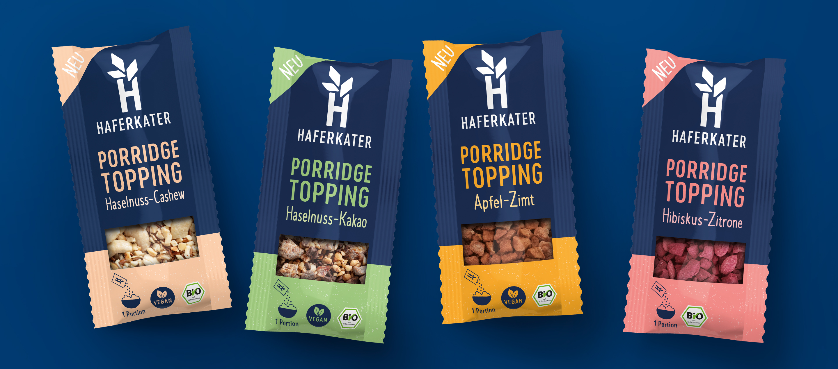 Ein Konzept, das die Markenidentität lebendig macht und das Produkterlebnis stärkt – das ist das Ziel unseres Packaging Designs für Haferkater. Das Berliner Unternehmen bietet frisch zubereitete Porridges und ein nahrhaftes Snackangebot zum Mitnehmen in Stores an zentralen urbanen Verkehrsknotenpunkten in ganz Deutschland, in ICE-Restaurants und im ausgewählten Lebensmitteleinzelhandel. Natürliche Zutaten, bewusster Genuss und Frühstück mit positivem Impact stehen dabei im Fokus – ganz nach dem Motto „Porridge mit Purpose“.