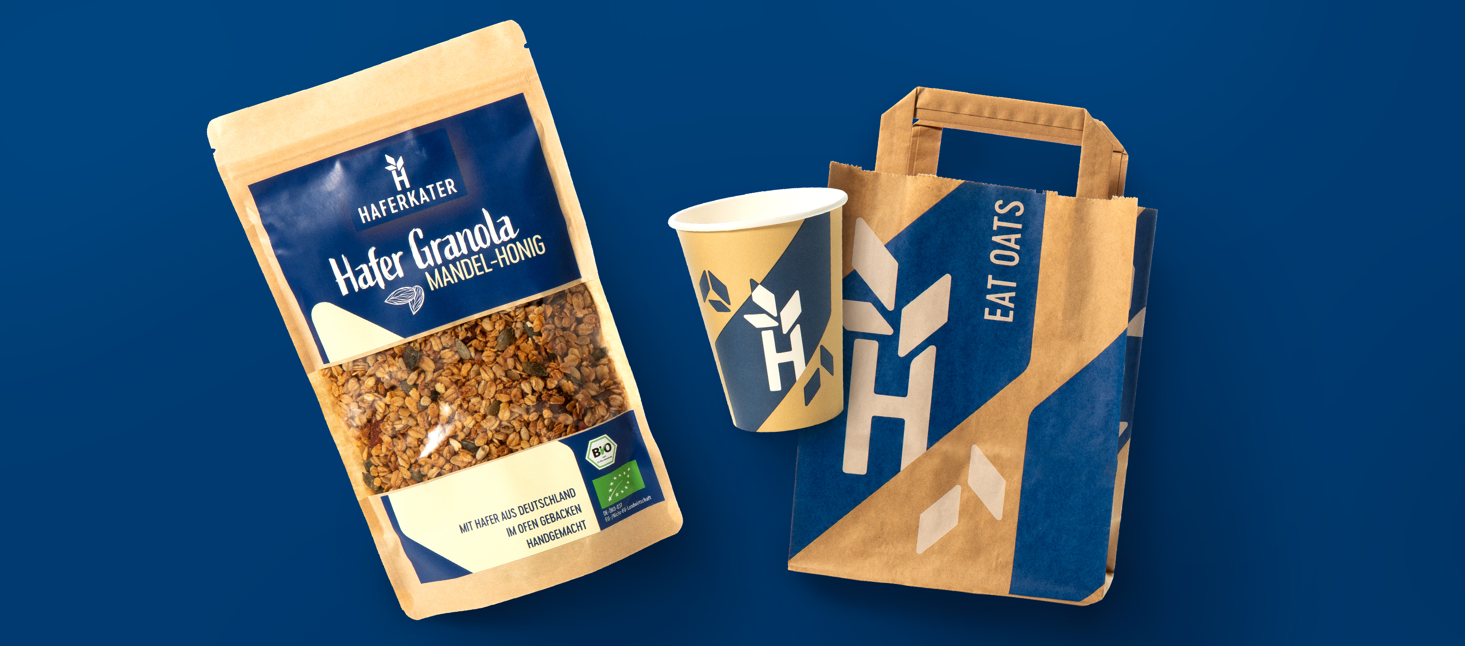 Unser klares, einfaches Packaging Design entwickelt die stilisierte Ähre des Logos weiter und prägt sie als kraftvolles Stilelement. Wir gestalteten Neuprodukte wie Toppings und Granola sowie Becher, Tüten, Wrap-Papier und Porridge-Becher für die Filialausstattung. Die Verpackungen sind teilweise kompostierbar und spiegeln den hohen Anspruch des Unternehmens an Nachhaltigkeit und Transparenz wider.
