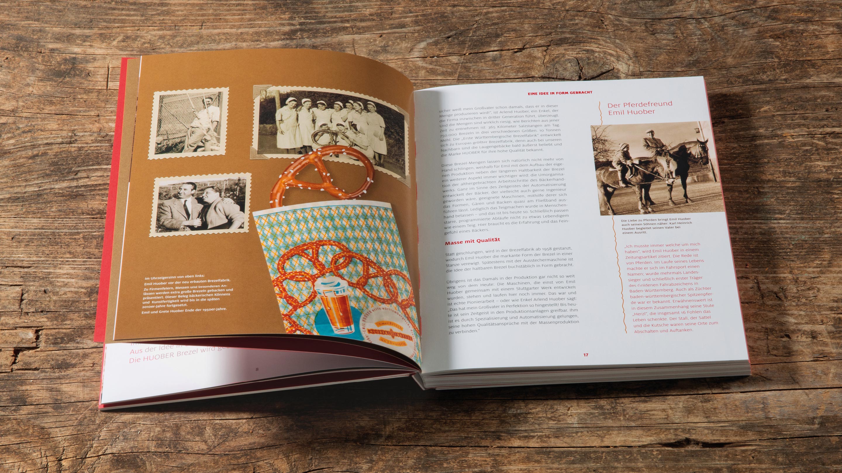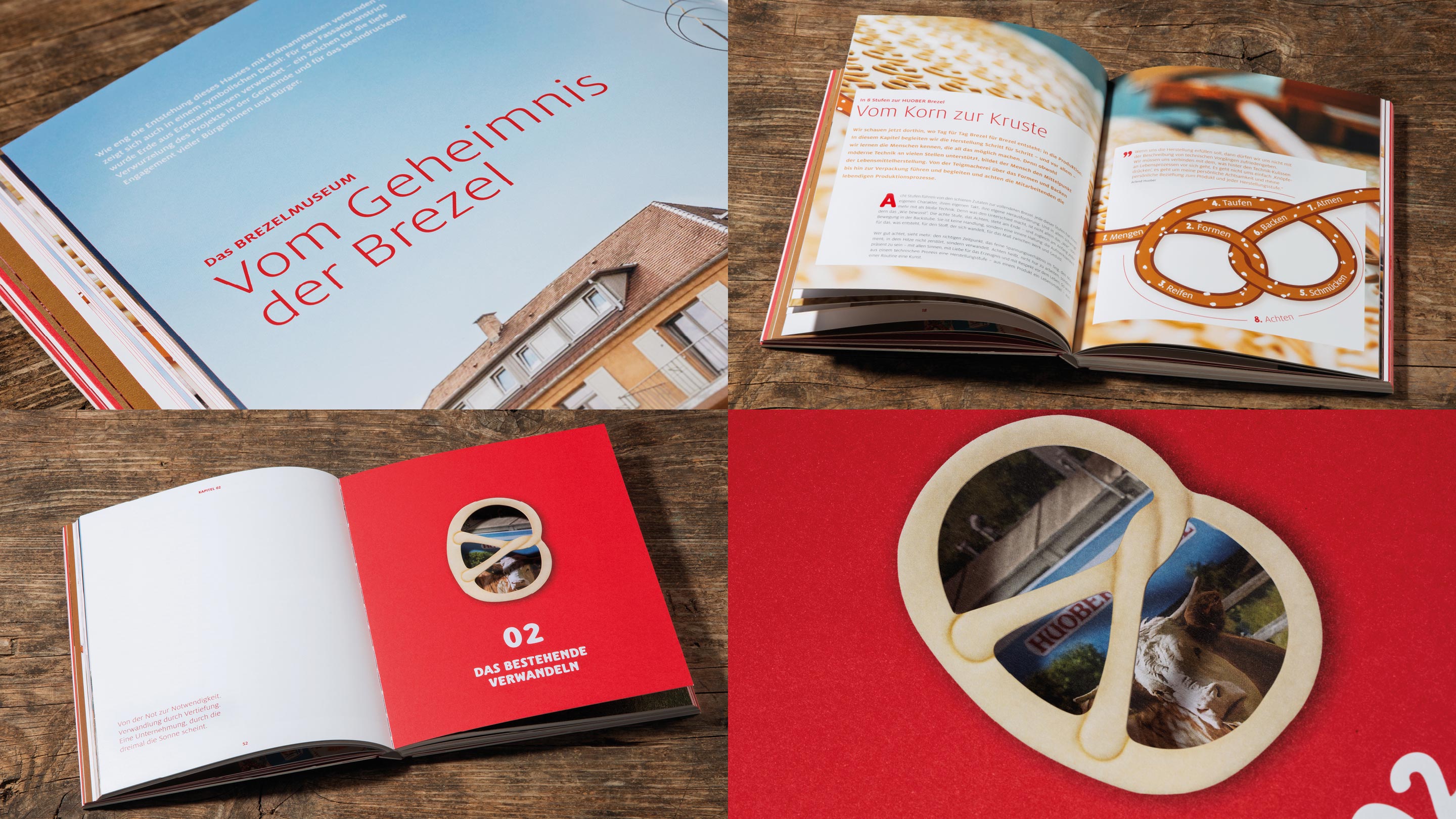 Wir entwickelten eine Gestaltung mit klarem Leitmotiv: ein illustrativer Brezelteigstrang, dem sowohl der Bezug zum Handwerk als auch die Einbindung historischer Zeugnisse authentisch gelingt. Typografie, Materialwahl und Layout führen Vergangenheit und Gegenwart zusammen und verleihen dem Buch eine visuelle Ruhe, die den Geschichten Raum gibt. Drucktechnische Finessen wie Veredelungen und Ausstanzungen in Brezelform nehmen den Claim „Die Marke durch die dreimal die Sonne scheint“ auf und sorgen für ein hochwertiges, stimmiges Gesamtbild, das den Auftraggebern besonders wichtig war.