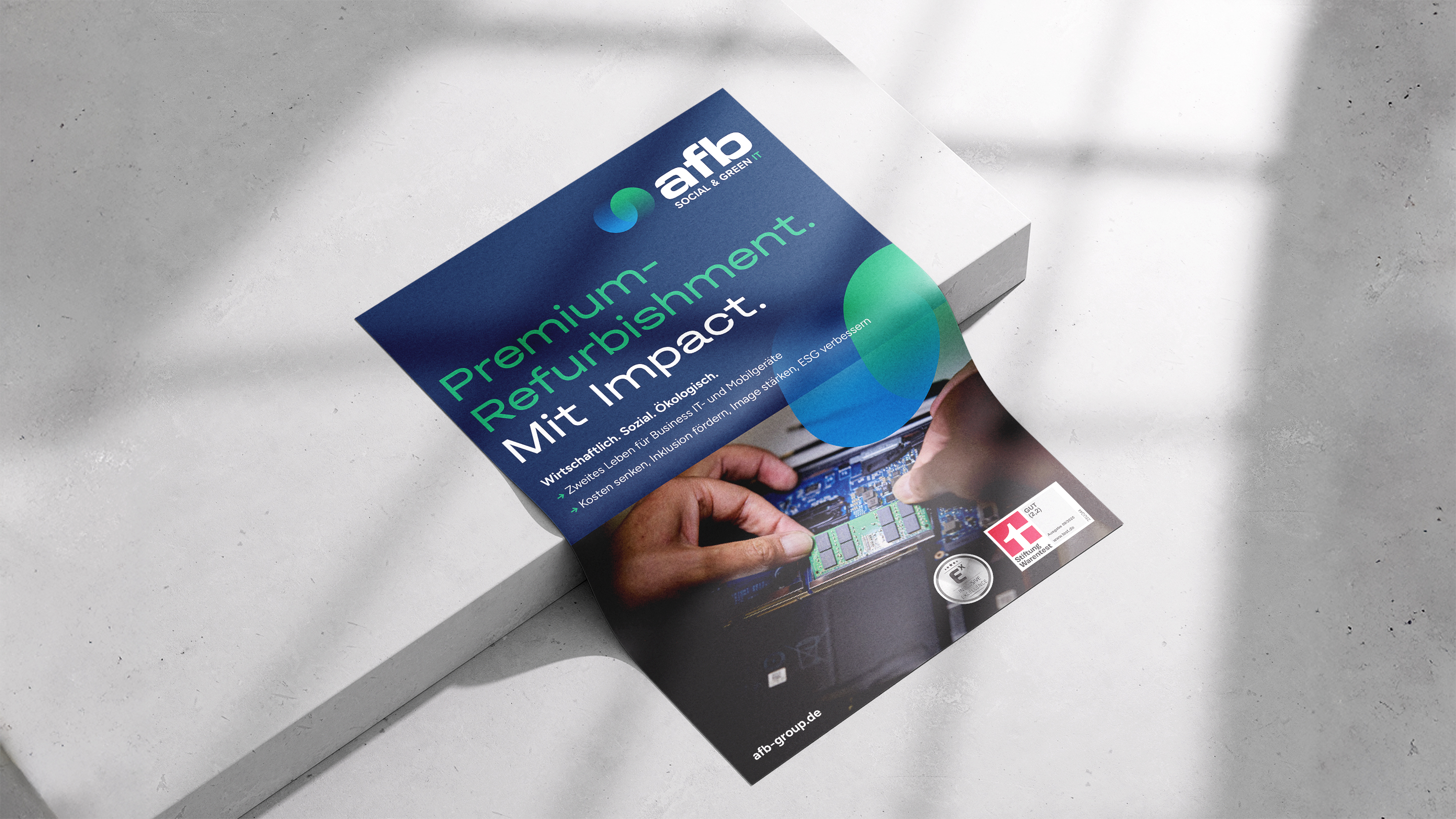 Doppelt nachhaltig – das ist das Green-IT-Konzept unseres Kunden afb social & green IT. Der IT-Refurbisher kauft gebrauchte Laptops, Smartphones und andere IT-Hardware, löscht alle Daten sicher, bereitet die Geräte professionell auf und bringt sie als hochwertige Second-Life-Produkte zurück in den Kreislauf. Und das als inklusives, gemeinnütziges Unternehmen, in dem Menschen mit und ohne Behinderungen gemeinsam arbeiten. In zwei Jahrzehnten ist das Unternehmen europaweit auf 20 Standorte und 700 Mitarbeitende gewachsen. Es war Zeit, den Markenauftritt zu modernisieren und zu professionalisieren.